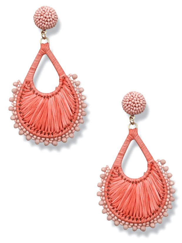 These beaded teardrop earrings feature intricate raffia detailing, adding a touch of sophistication to any outfit. Elevate your style and turn heads with these unique and versatile earrings.