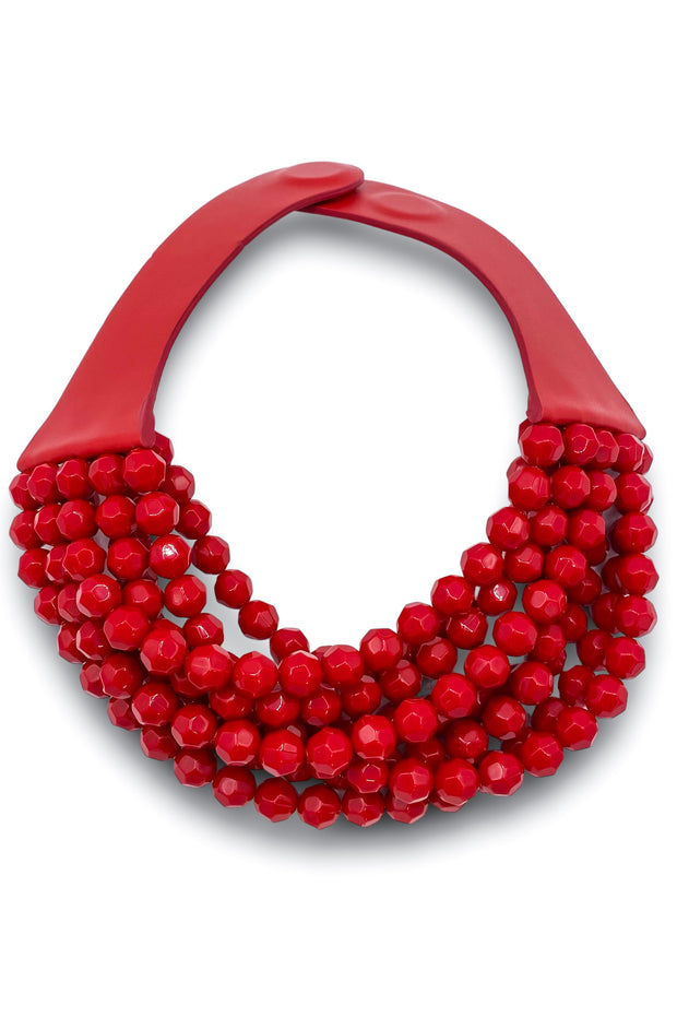 Introducing the Bella Style Necklace in Lipstick Red. This multi-strand necklace features lipstick red faceted resin beads and a trendy leather collar. The adjustable magnetic closure ensures a perfect fit. Elevate any outfit with this chic and versatile accessory.