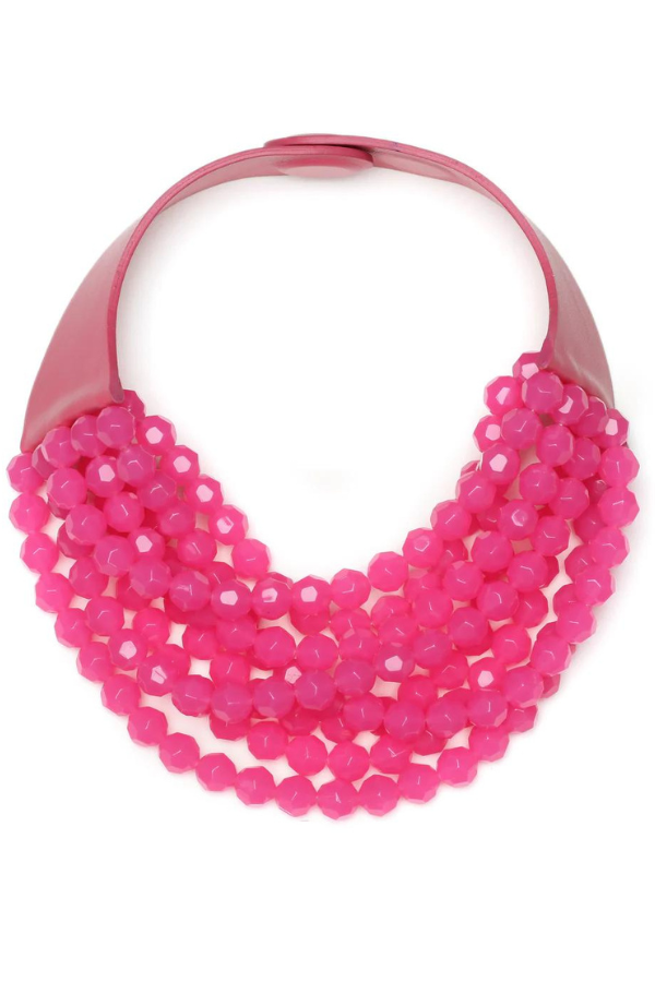 Introducing the Bella Style Necklace in Pink. This multi-strand necklace features Pink faceted resin beads and a trendy leather collar. The adjustable magnetic closure ensures a perfect fit. Elevate any outfit with this chic and versatile accessory.