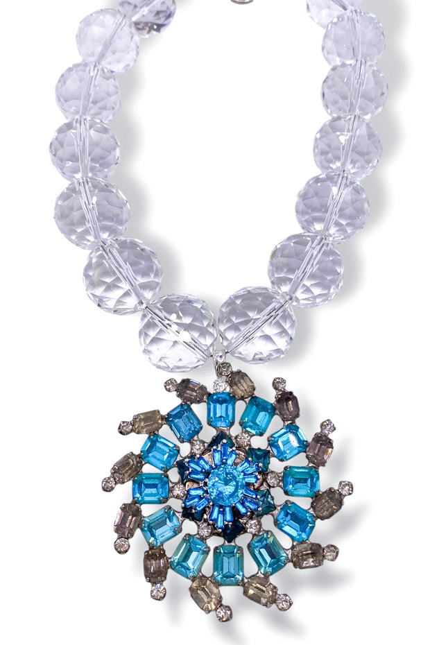 - 50s Aqua Tourmaline + Crystal Brooch Silver + Quartz Bail