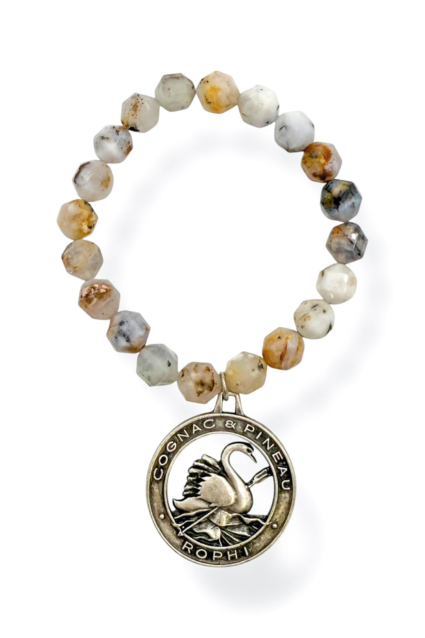 This bracelet showcases a single strand of Opal Prism beads accented with a Pineau medallion. It looks stunning on its own or layered with other pieces from our collection.
