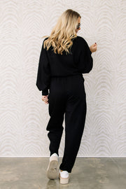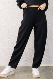 Effortless comfort meets modern style. Elastic waistband, functional side pockets, and soft scuba fabric create the perfect everyday pant. Flattering barrel silhouette.