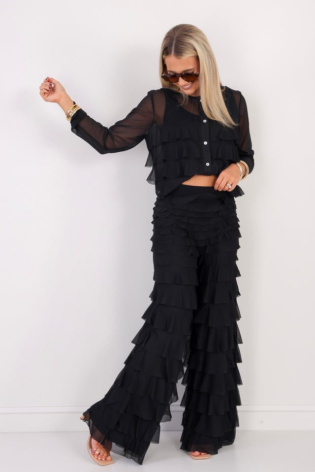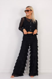 Effortlessly elevate your wardrobe with our Cha Cha Pant. The pull-on elastic waistband ensures a comfortable and secure fit, while the ruffled silhouette adds a touch of femininity. Made with a faux leather look, these pants exude a sleek and sophisticated style. Complete your look with the wide leg design.