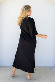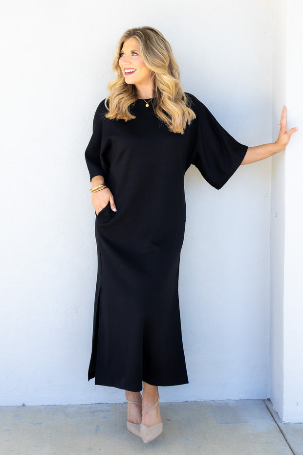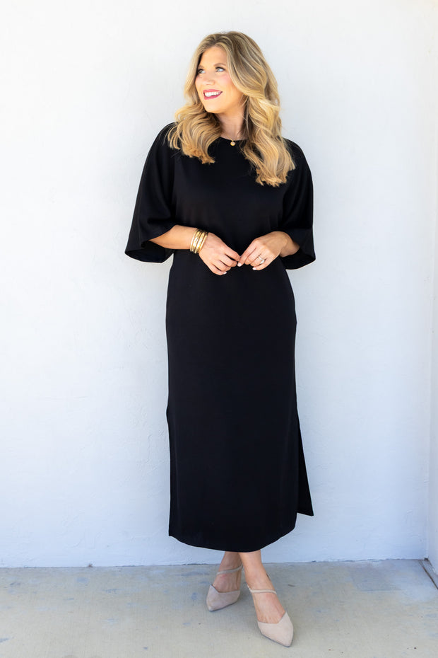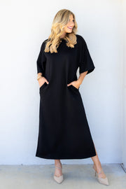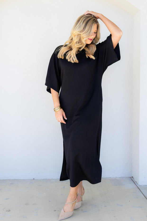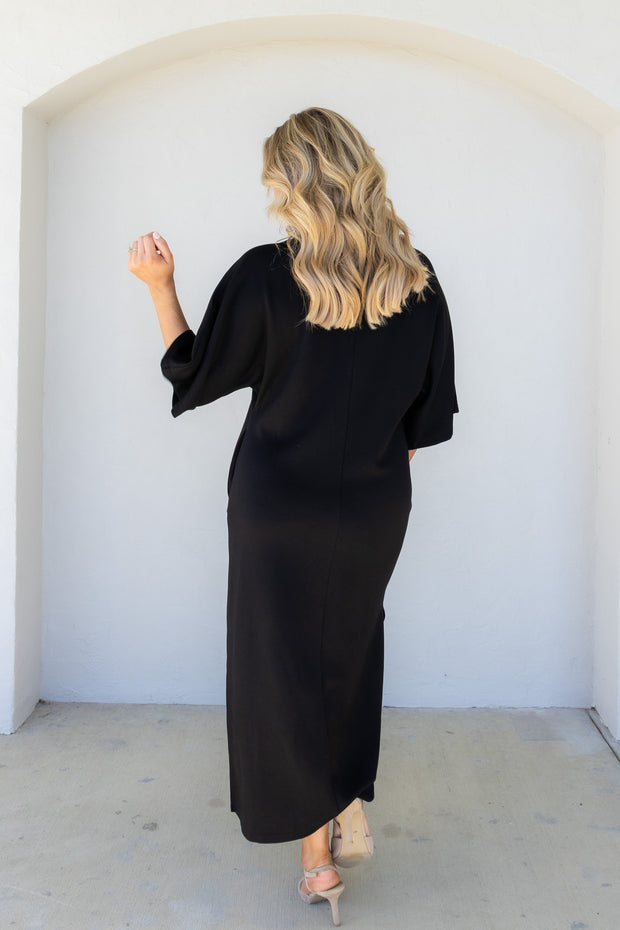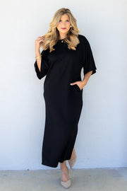 This black maxi dress features a rounded neckline and short sleeves, blending comfort with elegance. Its flowing length offers a graceful silhouette, perfect for day-to-night wear.