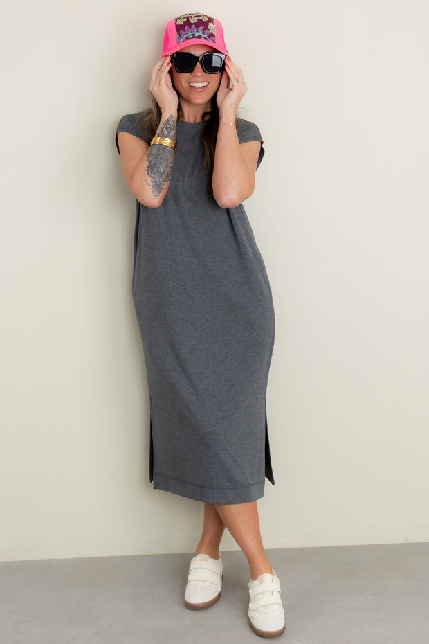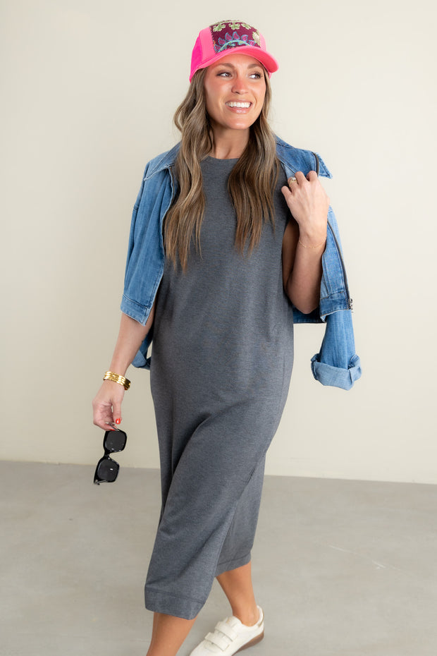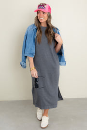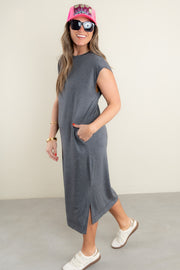 With its rounded neckline, sleeveless design, and midi length, this dress exudes elegance and grace. Perfect for any occasion, it also features convenient side pockets for a touch of practicality.