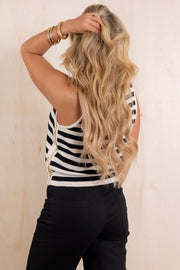 This sleeveless tank features a rounded neckline and a waist-length cut, crafted from soft sweater material for comfortable wear. Its striped print adds a classic touch, making it a versatile piece for warm city days.