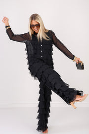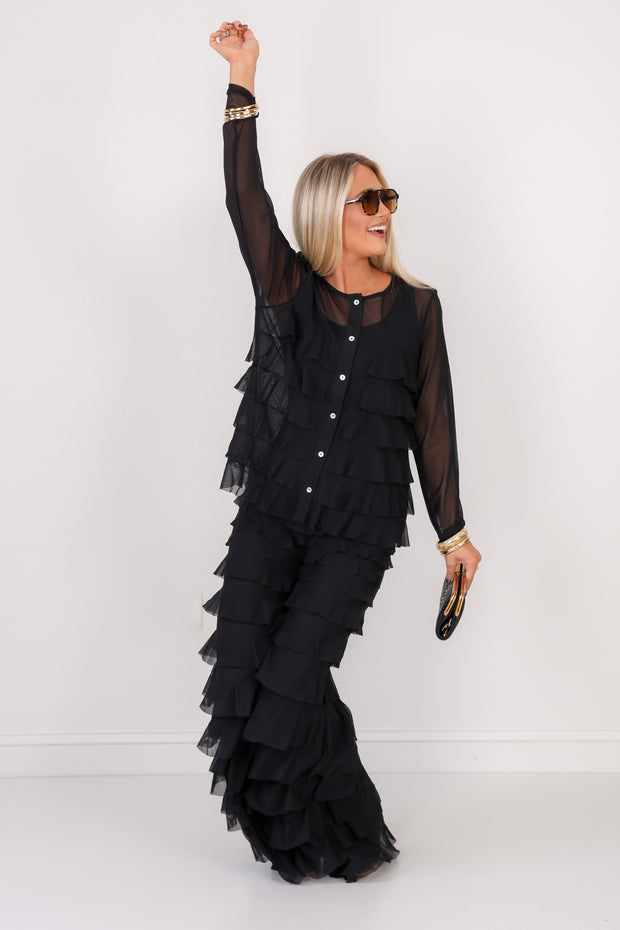 The Chacha Cardigan is an exceptional piece with its thin, faux leather material, long sleeves and elegant ruffled silhouette. Its button down front adds a classic touch, perfect for layering during cooler months. Stay stylish and comfortable with this lightweight cardigan.