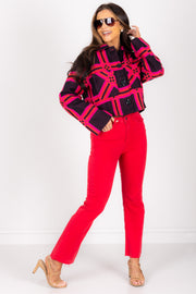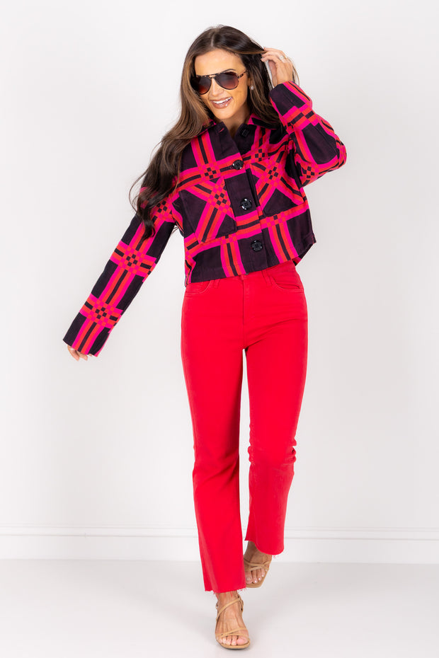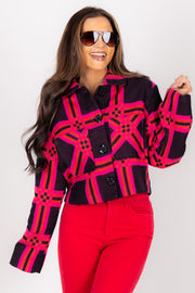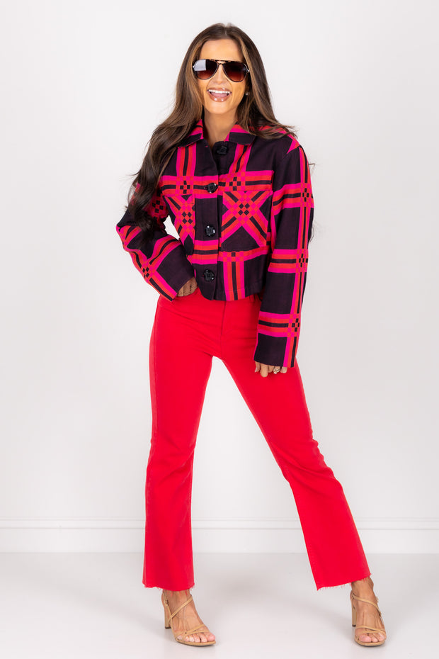 Timeless black plaid jacket with a cropped silhouette, long sleeves, and classic button-down front. The structured top collar adds polish to any outfit.