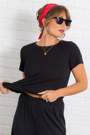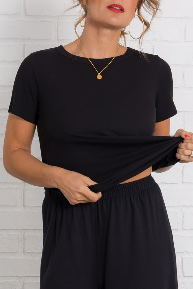 With a classic rounded neckline and ribbed material, this waist-length top exudes sophistication. Perfect for both casual and formal occasions, its short sleeves offer comfort and versatility.