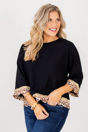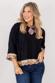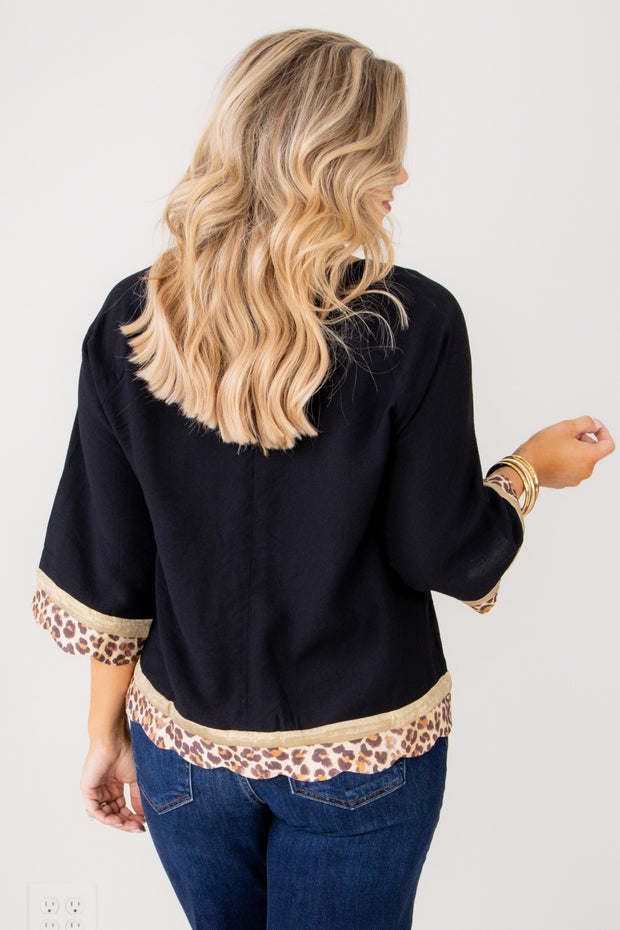 This long sleeve top features a rounded neckline and eye-catching leopard detailing for a subtle statement. The scalloped hemline adds a delicate touch, making it perfect for effortless everyday style.