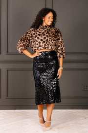 The Off the Top Black Sequin Skirt features a comfortable elastic pull-on waistband for easy wear and a flattering fit. Its midi length and sparkling black sequins make it perfect for adding a touch of elegance to any outfit. Ideal for both casual and dressy occasions.