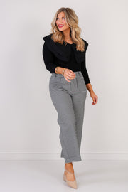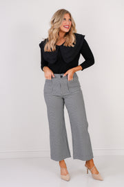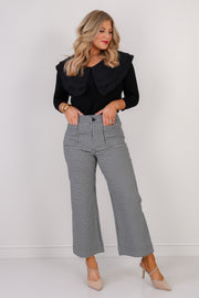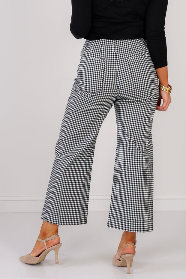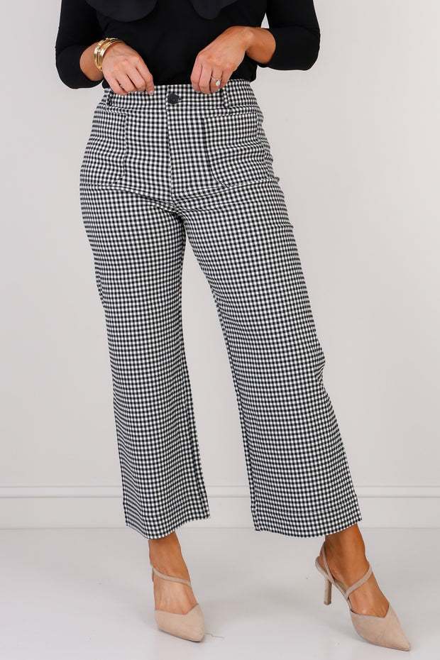 These black gingham straight leg pants feature a front zip button closure for easy wear and a classic gingham print that adds timeless style. The straight leg silhouette offers a comfortable and flattering fit for everyday wear.