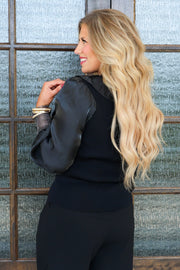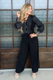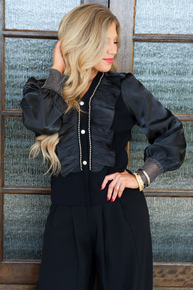 The More Than Enough Black Ruffle Sweater Top features a button-down design with sparkling crystal rhinestone buttons and rhinestone accents on the sleeves. Its long sleeves, ruffle details, and V-neckline create a stylish and elegant look, perfect for adding a touch of sparkle to your outfit.