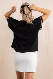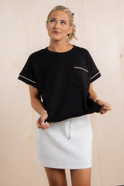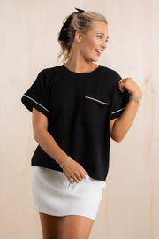 This black short sleeve top features white line detailing, real front pocket, and a round neckline. Made from butter-soft, comfortable material, it offers both style and ease for everyday wear.