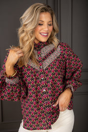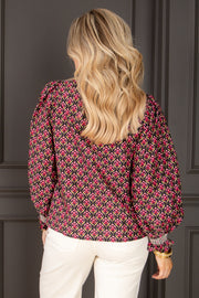 The Talk About It Black Floral Print Top features breathable fabric with smocked neck and bust detailing, a feminine ruffle collar, and long sleeves for elegant, comfortable wear.