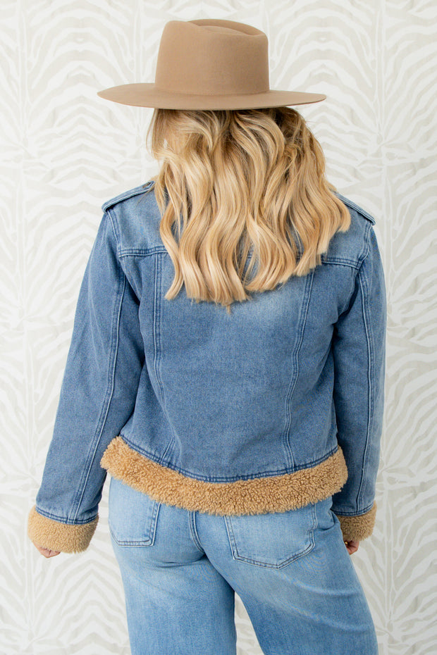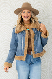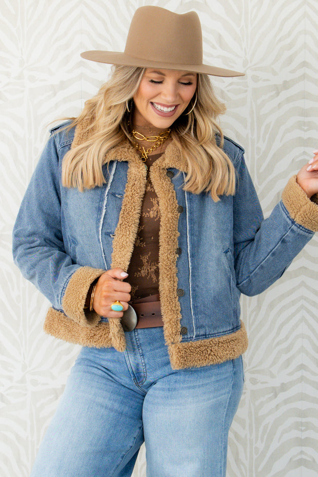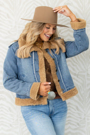 This Jacket features a cozy sherpa interior, long sleeves, waist-length fit, button-down front, and convenient side pockets for everyday comfort and style.