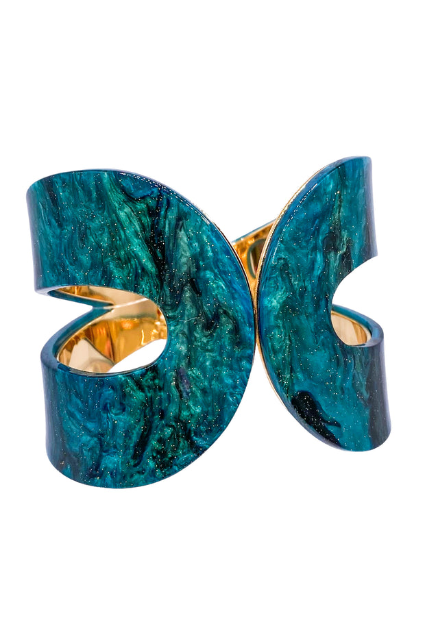 The Down The Line Bracelet features a sleek gold cuff design and vibrant acrylic coloring with watercolor details, adding a touch of elegance to any outfit. The perfect accessory for a sophisticated and stylish look.