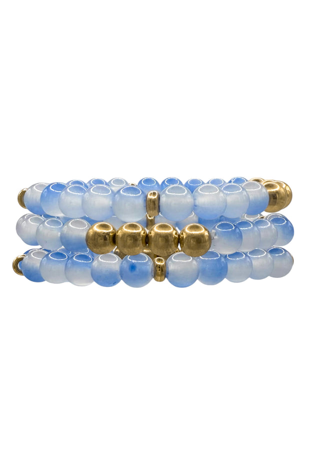 This Ocean View Beaded Bracelet Set features a stunning combination of beaded glass and gold beads. The delicate design adds a touch of elegance to any outfit. Perfect for day-to-night wear, this set will effortlessly elevate your look.