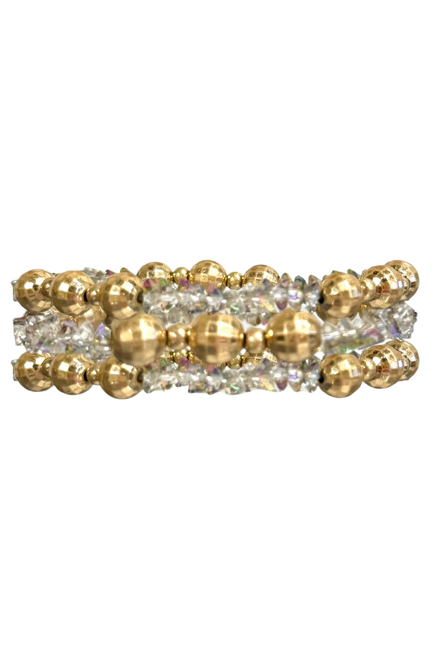 This bracelet Set features multi-layered stretch bracelets with faceted metal ball beads and smooth beads. These bracelets provide a comfortable fit and add a subtle sparkle to any outfit.