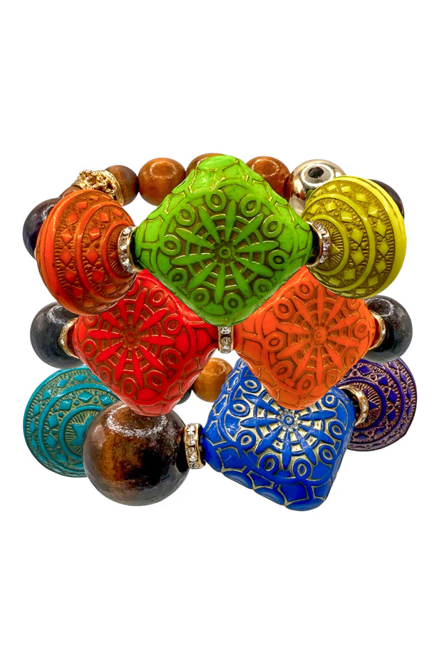 This set of stretch bracelets combines colorful patterns with natural wood beads for a stylish, comfortable accessory. Easy to wear and versatile, they add a vibrant, earthy touch to any outfit.