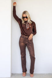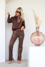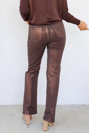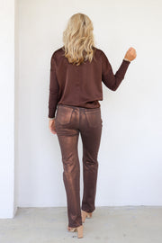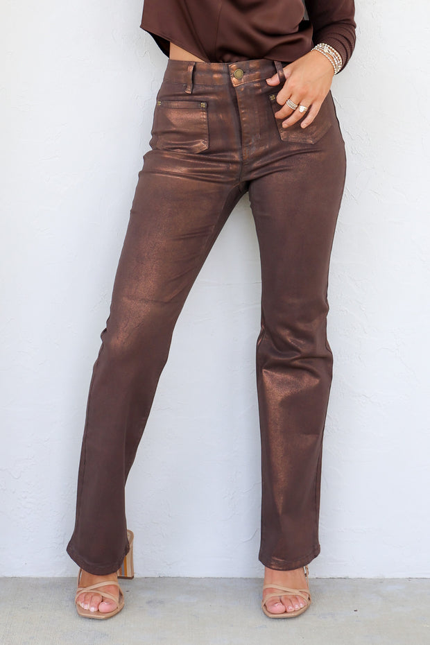 These bronze metallic flare leg pants by Charlie B feature zip and button closures for a secure fit. They include front and back pockets for added functionality and style.