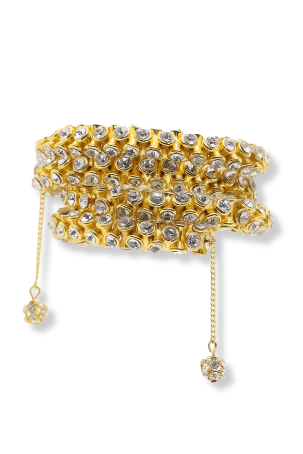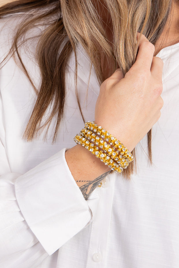 A coil of brass with over 400 crystals wraps around your wrist for instant glamour. Handcrafted in Rajasthan, India, the Crystal Wrap is a wonderful addition to any bracelet stack. It fits any wrist and resiliently snaps back into shape...