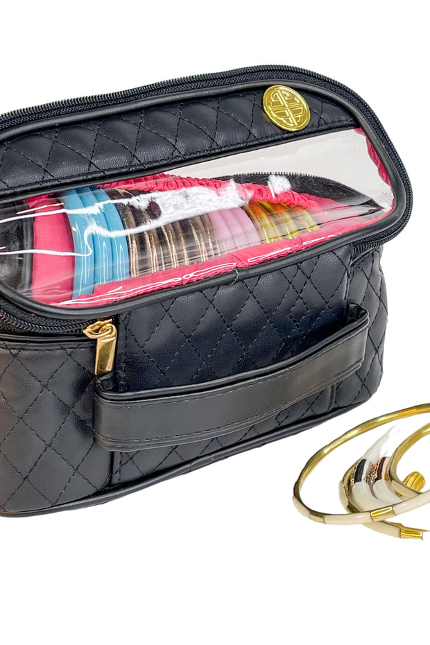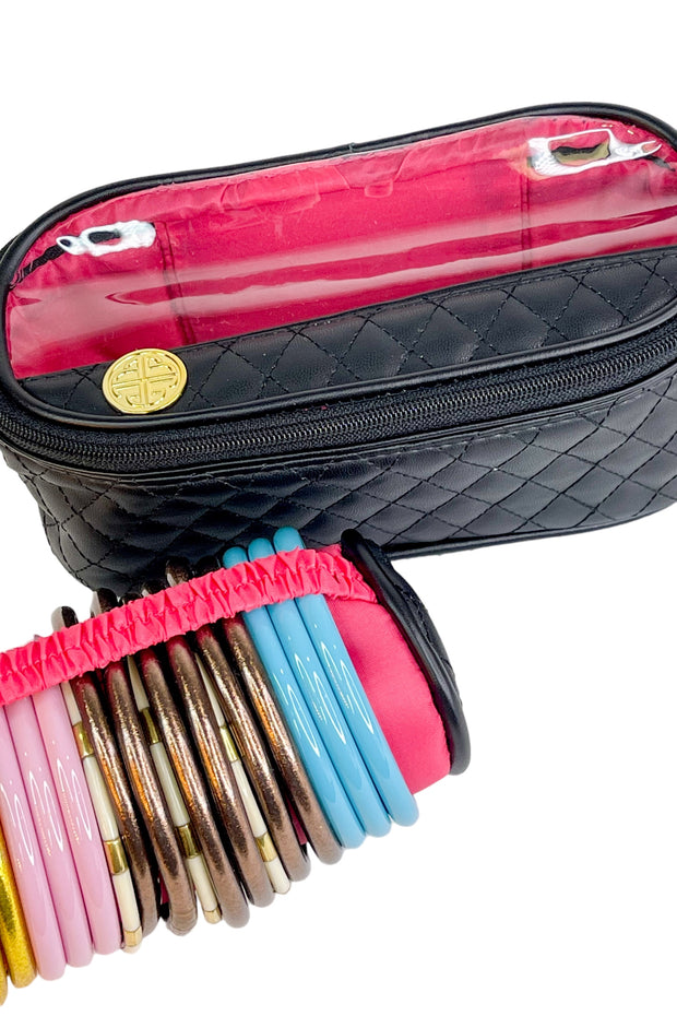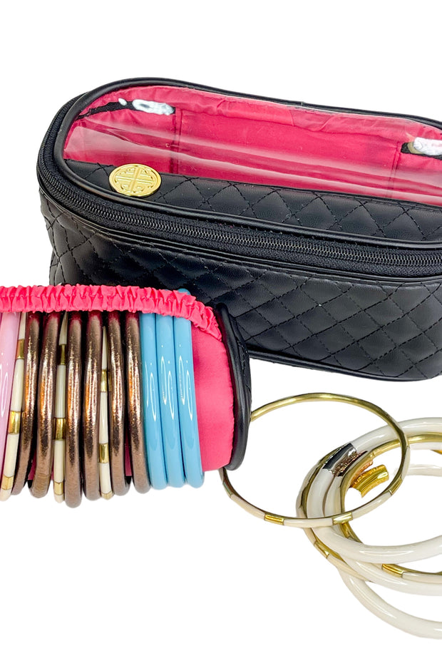 All Weather Bangle Travel "pochette". Classic quilted vegan leather is lined in our iconic BuDhaGirl pink satin. A bangle carrier roll is removable so you may easily pack your bangles and safely secure them with its elastic strap. Crafted in India exclusively for BuDhaGirl. BON VOYAGE! BTW...perfect for storing your bangles at home too.
