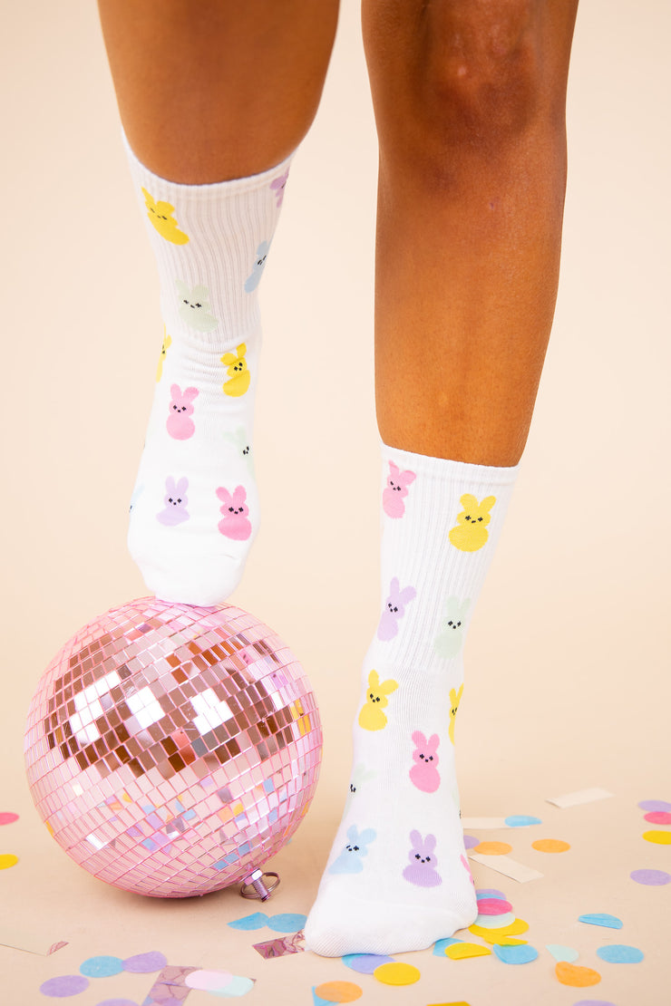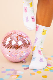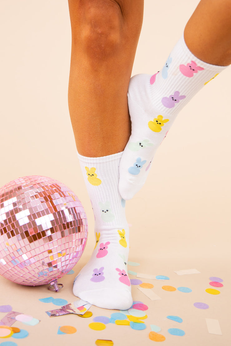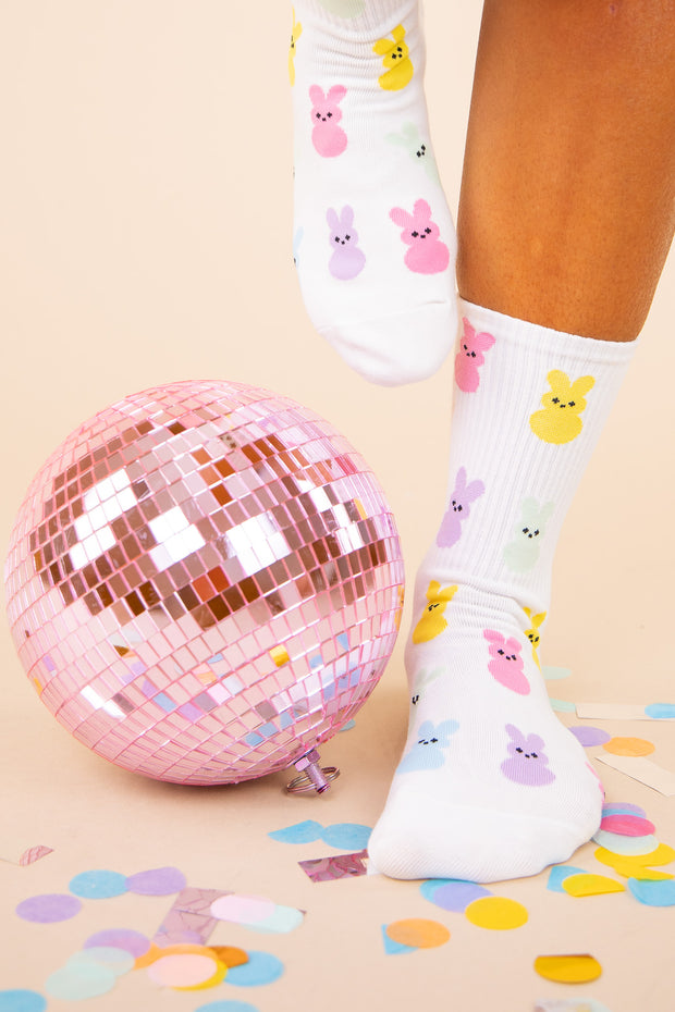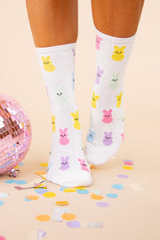 Socks are a must have, so why not wear cute ones? This is a white sock with little colorful bunnies on them. These are perfect for gifts, movie nights, and so much more!
