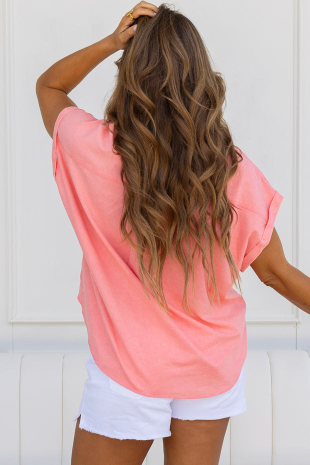 Stay comfortable and stylish in our Coral Sands Top. This top features a top collar, short sleeves, and a button down front for a classic look. Crafted from linen material, it offers both breathability and a front pocket for added convenience. Perfect for any occasion.