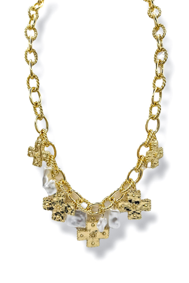 This delicate charm necklace features an elegant Byzantine cross paired with lustrous multi-pearl accents. Perfect for everyday wear or special occasions, it adds a touch of timeless sophistication to any outfit.