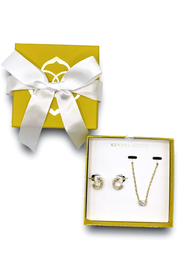 Take your everyday essentials to the next level with the Cailin Gold Crystal Gift Set of 2 in White Crystal. Combining timeless style with high-shine crystal, this precious pair is pre-wrapped and exclusively priced for easy gifting. Set includes the Cailin Pendant Necklace and Cailin Huggie Earrings.