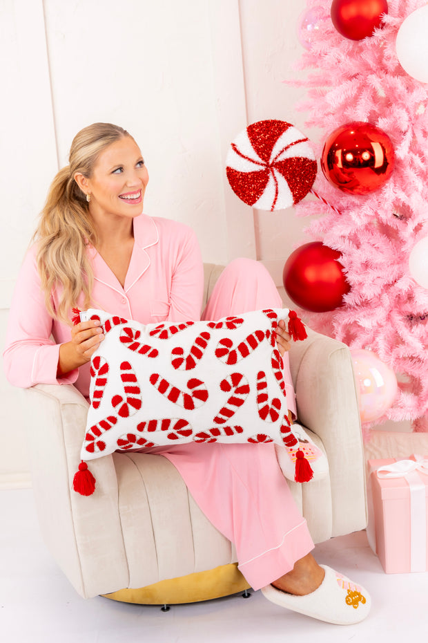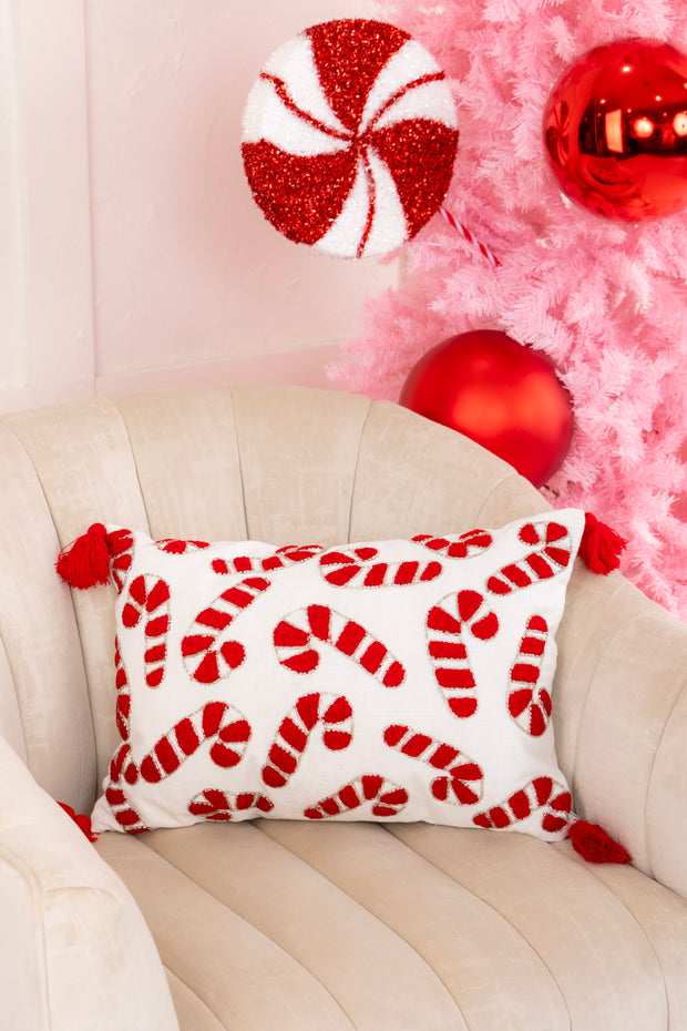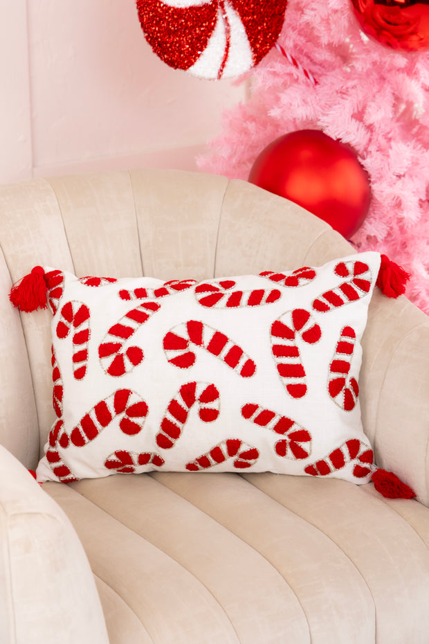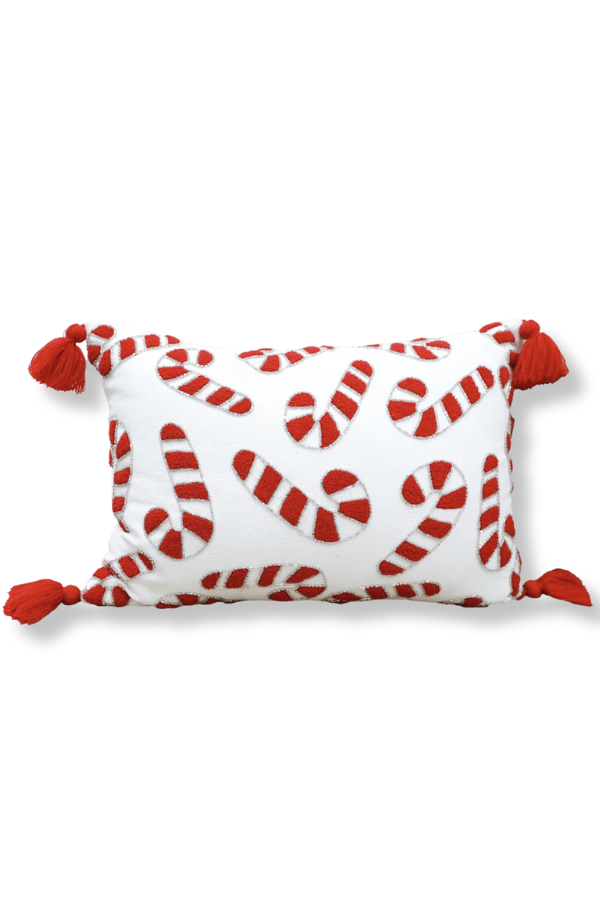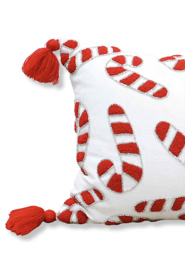 Add a sweet touch of holiday charm to your decor with our Candy Cane Lumbar Pillow! Featuring whimsical candy cane beaded embroidery and playful tassel details, this cozy accent pillow is the perfect way to bring festive cheer to your living space.