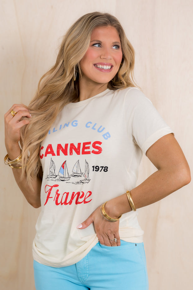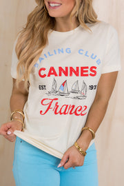 Featuring a rounded neckline, short sleeves, and waist length, this tee is perfect for everyday wear. The Cannes detailing on the front adds a touch of sophistication to your outfit. Crafted from high-quality materials, this tee offers both comfort and style.