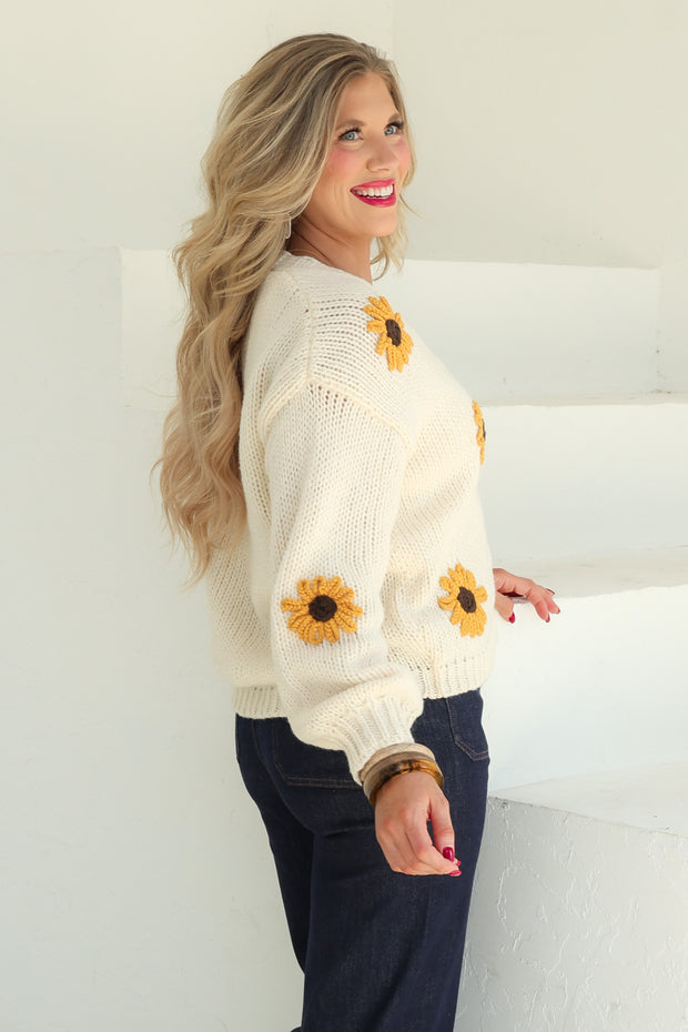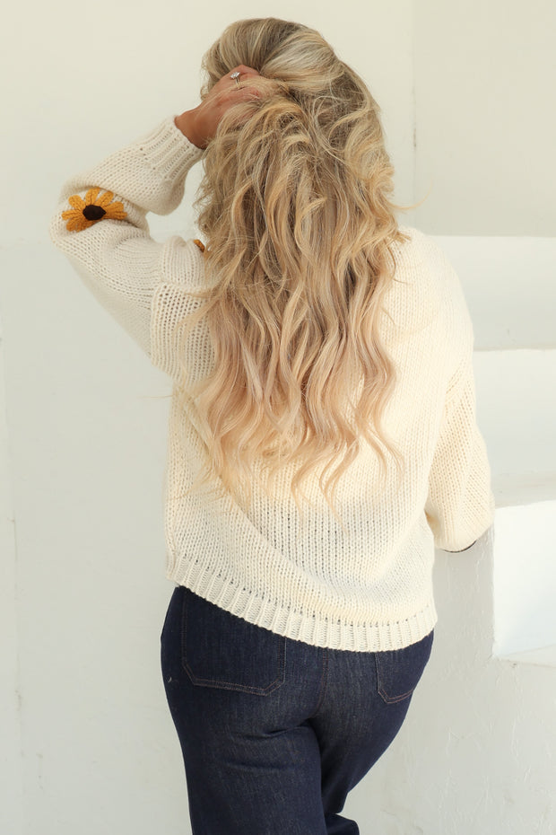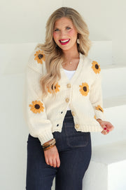 This cream cardigan features a flattering v-neckline and long sleeves for cozy coverage. Its waist-length cut and button-down front make it easy to layer, while delicate daisy detailing adds a charming, subtle touch of style.
