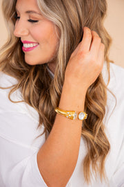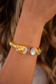 Sparkling rose-cut endcaps accented with pear shape gemstones and freshwater pearl on a luxuriously gilded cuff.