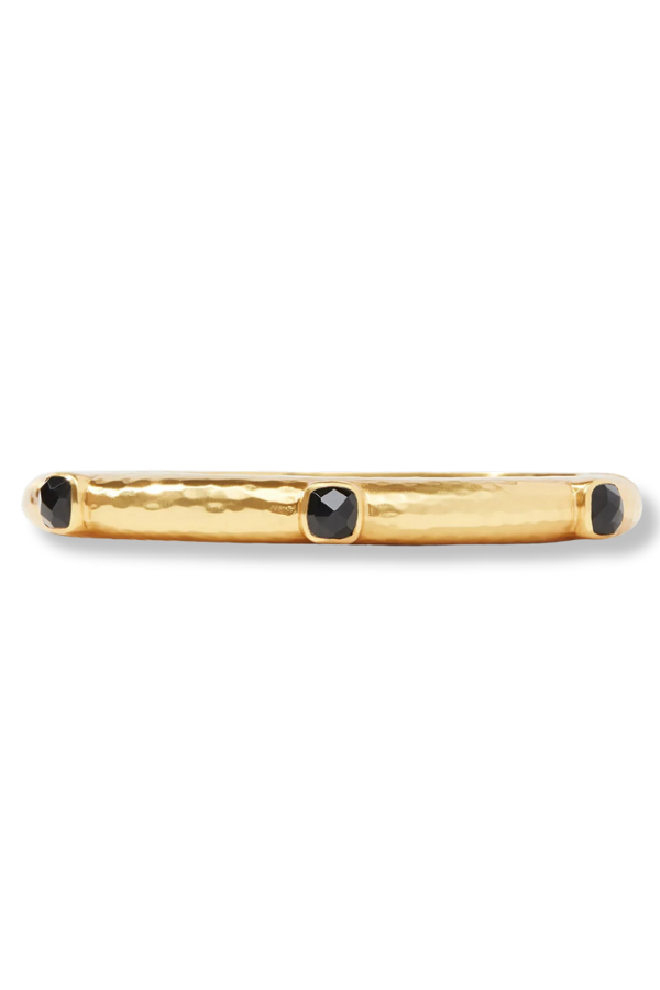 Lightly hammered bangle showcasing six stations of rose-cut imported glass with mother of pearl doublet.