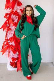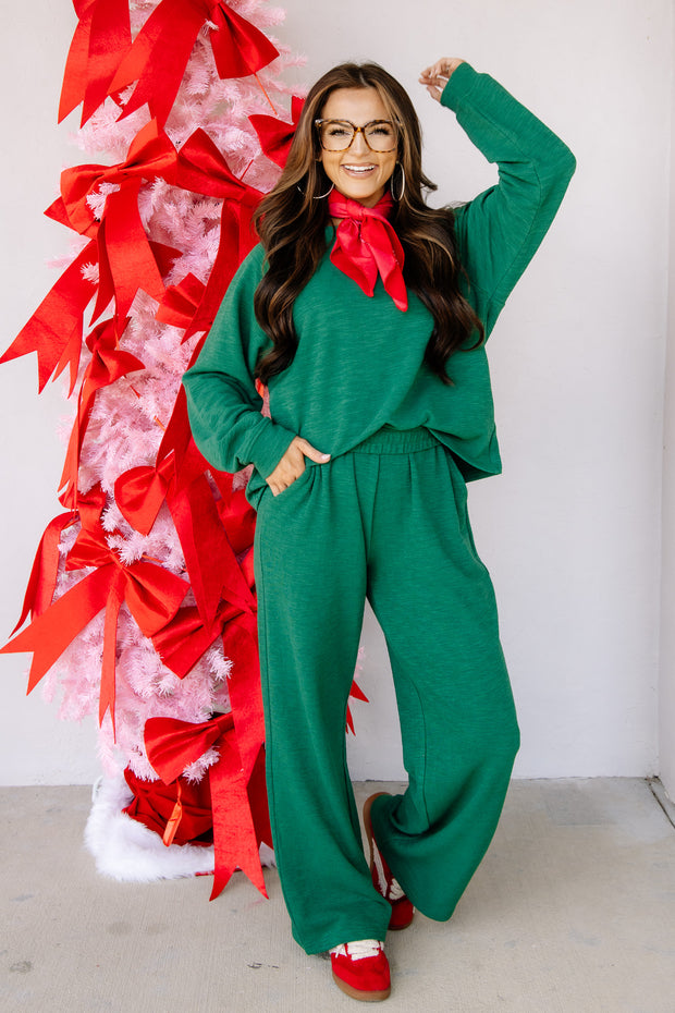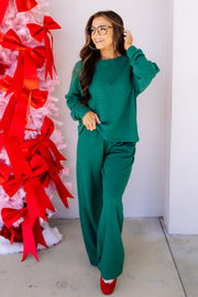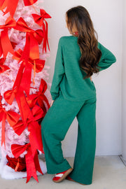 The Catch Up Dark Green Pants Set features a cabernet short sleeve top with a round neckline, paired with wide-leg pants that have an elastic pull-on waistband and side pockets. Made from breathable, comfortable material, this set offers easy wear style without sacrificing comfort.