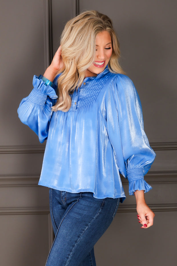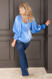 This blouse features a ruffled top collar and long sleeves, crafted from smooth satin material for a sleek look. Designed to sit at the waist, it offers a flattering fit ideal for both casual and dressy occasions. The metallic sapphire finish adds a subtle shine to your outfit.
