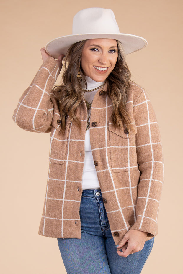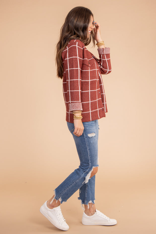 Stay cozy with Lasting Impressions' Shacket. This versatile plaid print piece features a button down front, long sleeves, and a top collar crafted from a thicker material for added warmth. Layer it over a light shirt or wear it alone for chic style.