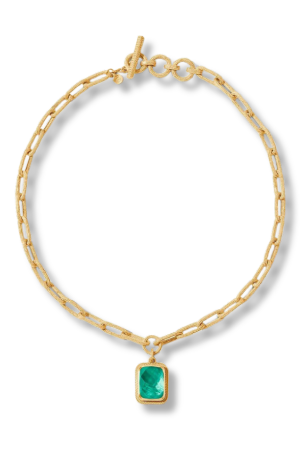 Expertly crafted by Julie Vos, this Cheval Paperclip Statement Necklace boasts an iridescent emerald green gemstone and braided golden wire accents. Its elegant design is completed with a matching toggle closure, making it the perfect addition to any outfit. Shine with confidence in this unique and eye-catching necklace.