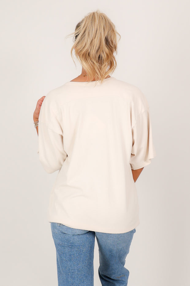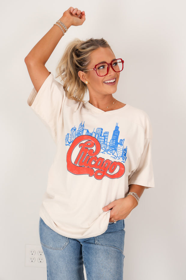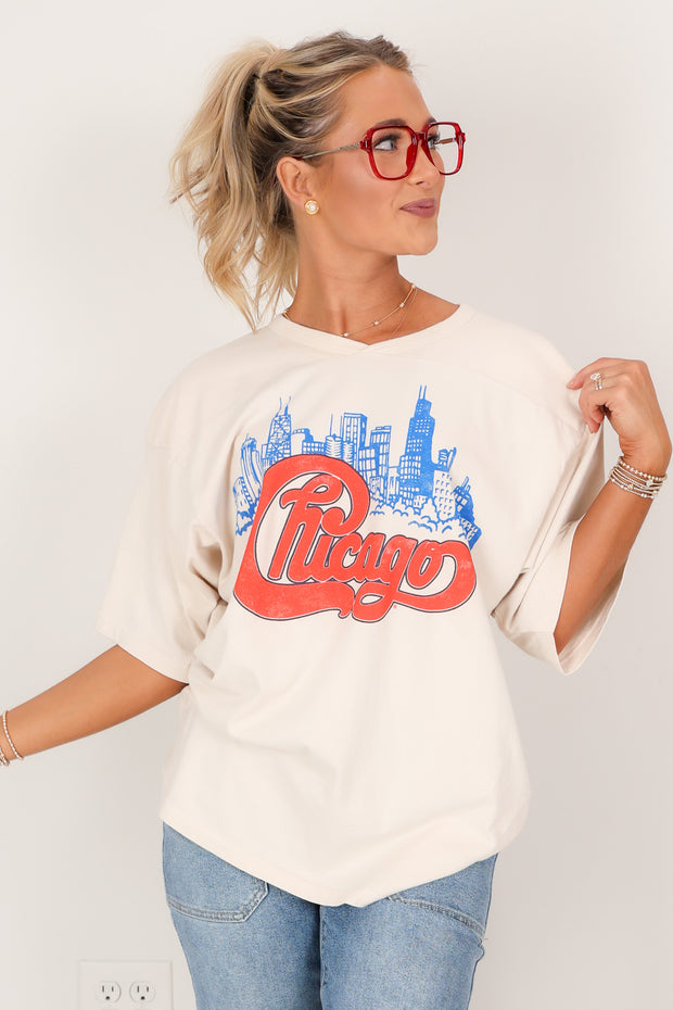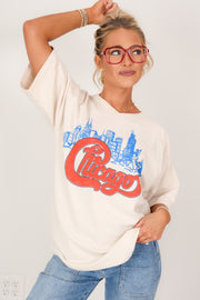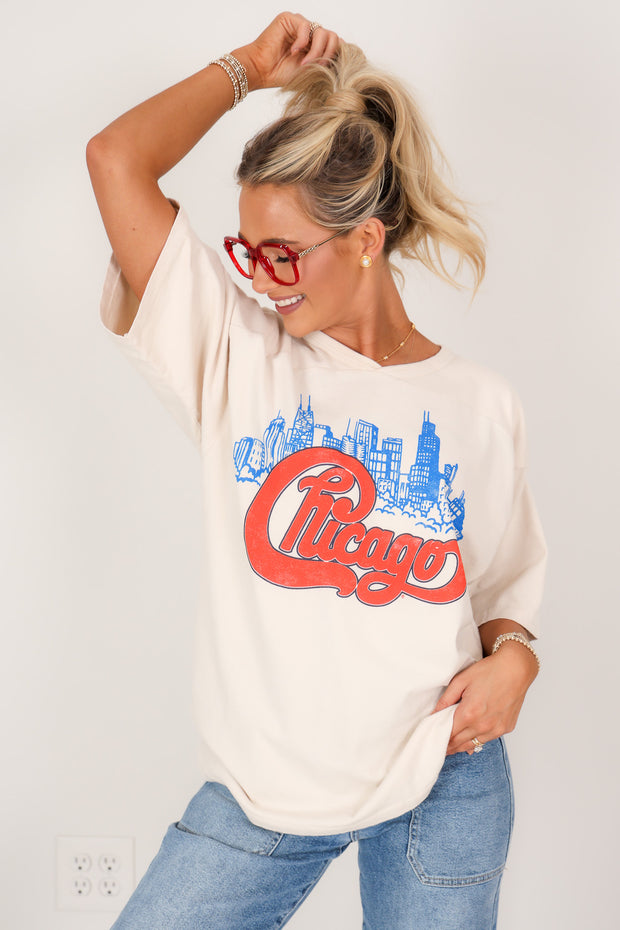 The Daydreamer Chicago Skyline Oversized Jersey Short Sleeve Tee features a dirty white color with a V-neckline and a graphic of the Chicago skyline. Its relaxed fit and soft material make it a comfortable choice for casual, everyday wear.