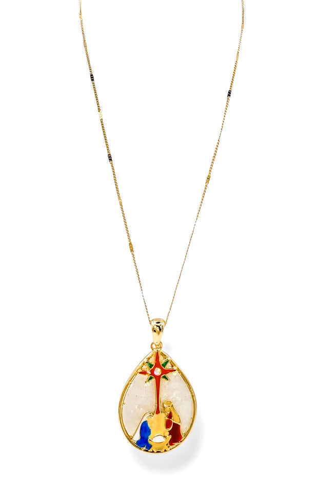Elegant chain necklace featuring a detailed Nativity Scene pendant, perfect for celebrating the Christmas season. This meaningful jewelry piece commemorates the birth of Christ with a classic design that pairs beautifully with holiday attire.