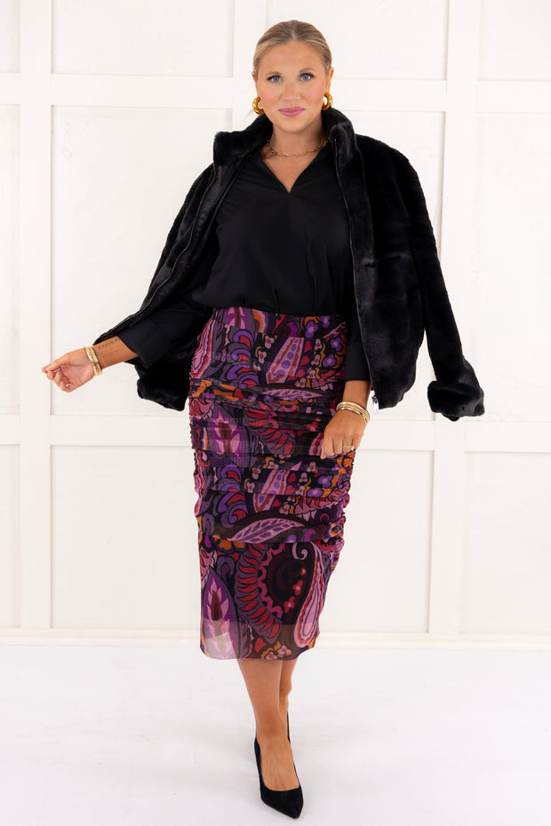 Expertly crafted, the Colette Skirt boasts an elastic waistband for added comfort and easy fit. With an inner lining, this midi length skirt offers a sheer material that drapes beautifully and features a modern abstract print. Perfect for any occasion, elevate your style effortlessly.