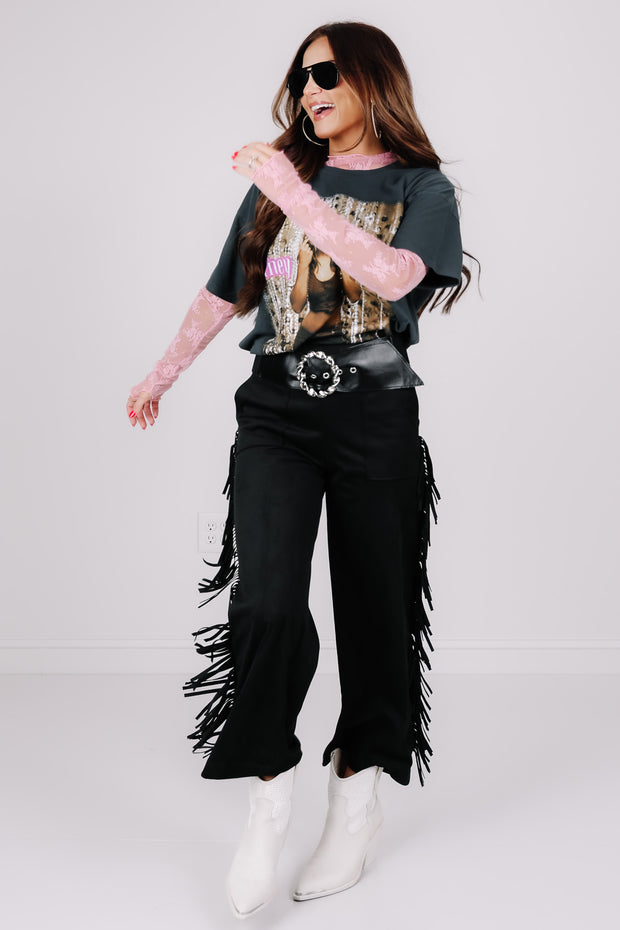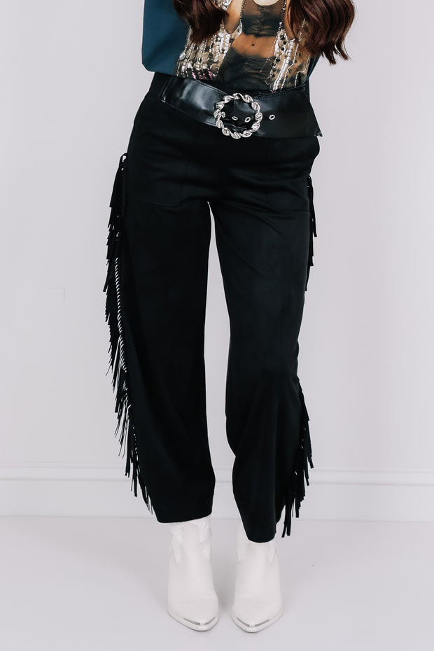 These black suede-like high-waisted wide leg pants feature fringe detailing down the sides, elastic pull-on waistband, belt loops, and front functional pockets for a comfortable and stylish fit.