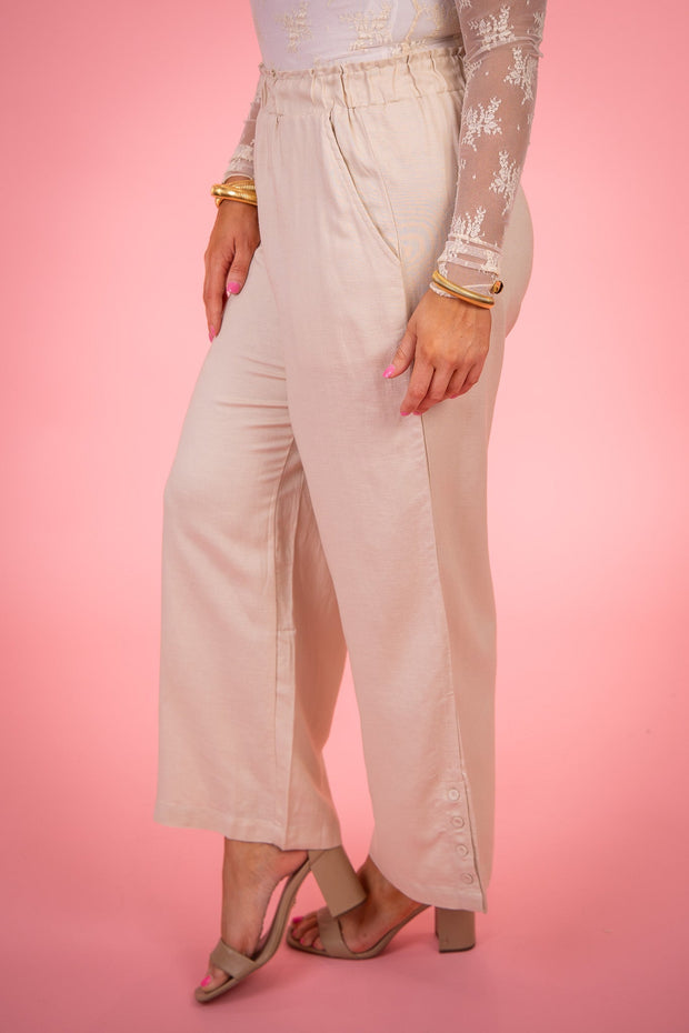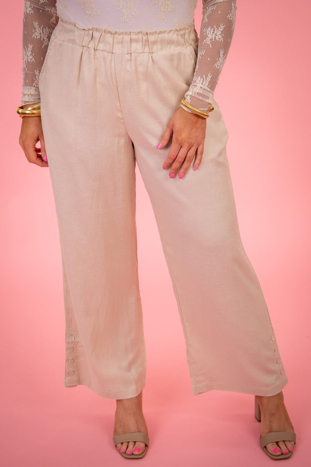 Go with the flow in these pull-on ankle pants rocking a wide leg that channels boho vibes. We love the breathable linen-blend fabric, stretchy elastic waist, functional pockets, ankle length, and side vents at the hem featuring a self-covered button.