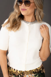 The Keeping Secrets Cream Short Sleeve Sweater Blouse features a breathable, comfortable fabric with a button-down front. Its standout crystal-embroidered neckline and collar add a touch of elegance to this versatile cream top.