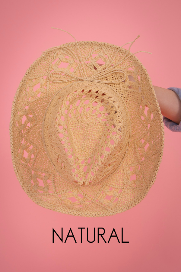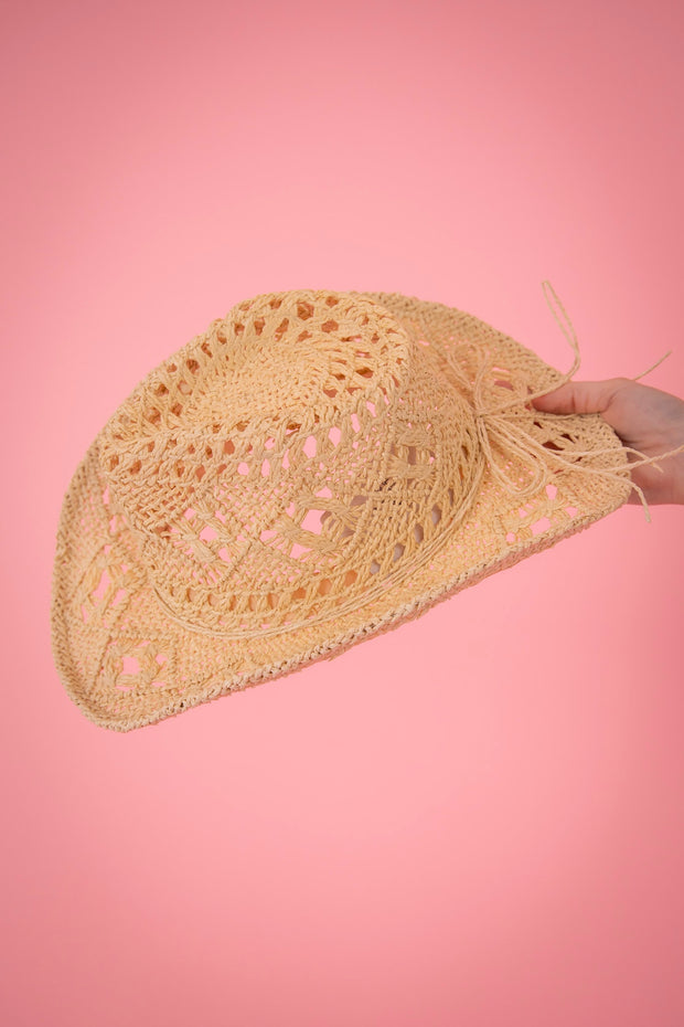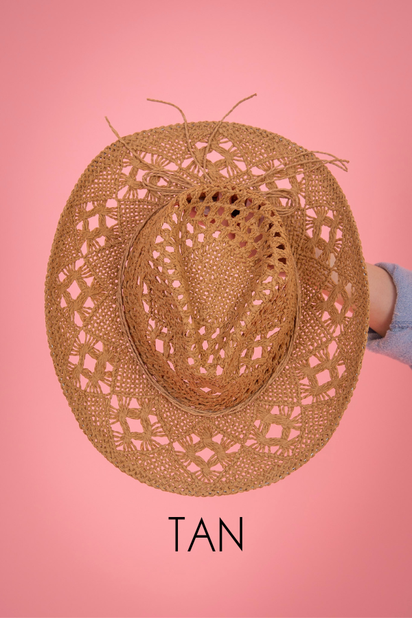 This On The Beach collection is a crocheted straw cowgirl hat, perfect for any sunny day. Made with high-quality straw, it provides stylish protection from the sun's rays. Expertly crafted, it offers a chic and comfortable fit for all-day wear. Enjoy the beach in style with this must-have accessory.