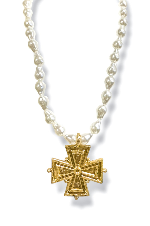 This necklace combines timeless elegance with a modern touch. Featuring a delicate cross pendant paired with unique baroque pearls, it adds a subtle statement to any outfit.