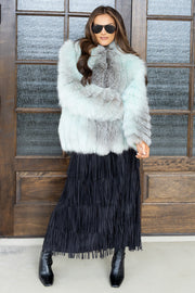 The Jacket features luxurious blue and black fox fur with long sleeves and a button-down front. Its waist-length cut provides a flattering fit, combining warmth and style effortlessly.