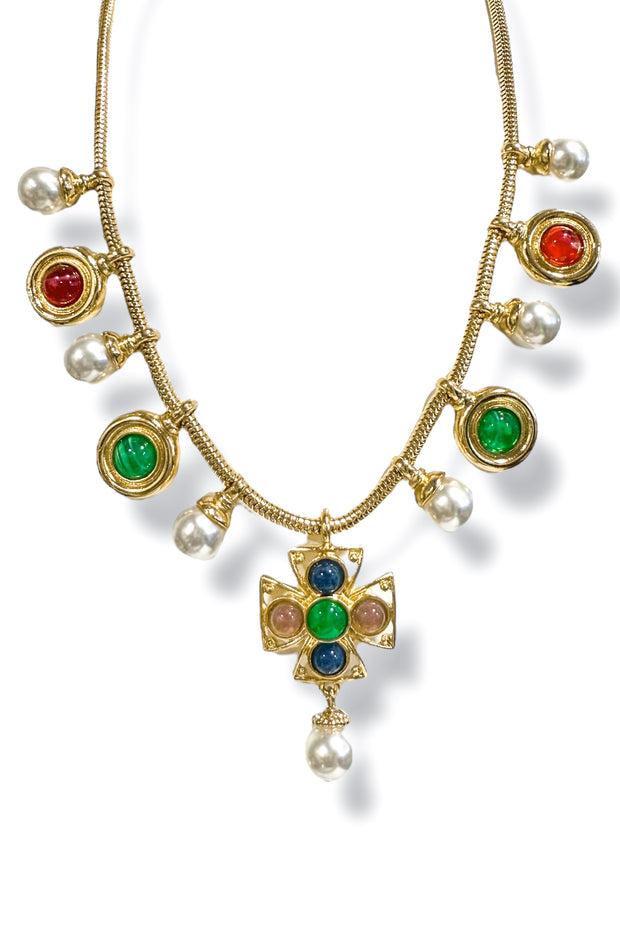 This necklace features a sleek snake chain adorned with multiple charms, including a stylish cross. Its versatile design makes it easy to layer or wear alone, adding a subtle touch of elegance to any outfit.